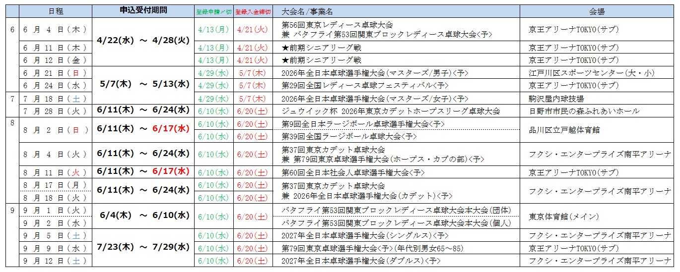 受付期間と参加するための登録締切を一覧でお知らせいたします。受付が大変早いため、ご注意ください。